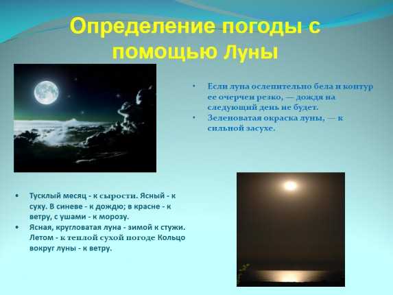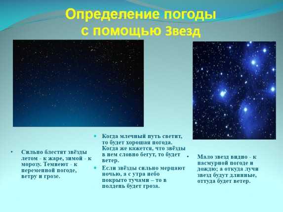 Когда млечный путь светит, то будет хорошая погода. Когда же кажется, что звёзды в нем словно бегут, то будет ветер. Когда млечный путь светит, то будет хорошая погода. Когда же кажется, что звёзды в нем словно бегут, то будет ветер. Черные круги около звезд - к дождю. Белые и красные - к теплой сухой погоде. Темные, зеленые и бледные круги - к дождю.