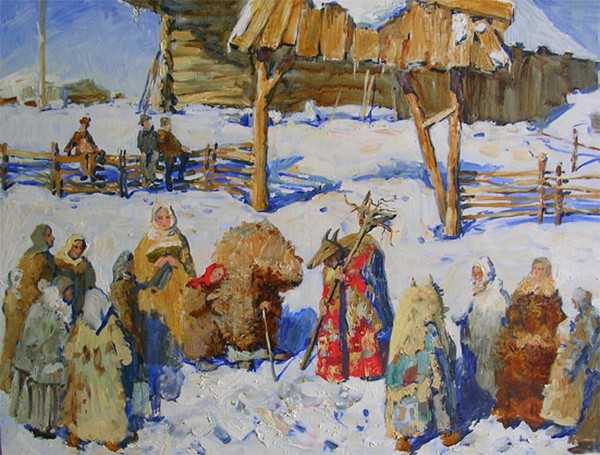 7 января (25.12) — Рождество Христово. 7 января (25 декабря по старому стилю) начинался главный зимний праздник — Рождество Христово. Вместе с ним начинались Святки — время от Рождества до Крещения, т. е. с 7 по 19 января по новому стилю. Это был своеобразный русский карнавал сродни византийскому празднованию календ, когда люди надевали маски, заходили в незнакомые дома с весёлыми песнями, принимая участие во всеобщем пиршестве и требуя награду за свои выступления.
