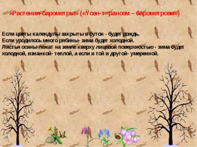«Растения-барометры» («Ÿсен-т=рансем – барометрсем») Если цветы календулы закрыты в бутон - будет дождь. Если уродилось много рябины- зима будет холодной. Листья осины лежат на земле кверху лицевой поверхностью - зима будет холодной, изнанкой- теплой, а если и той и другой- умеренной.