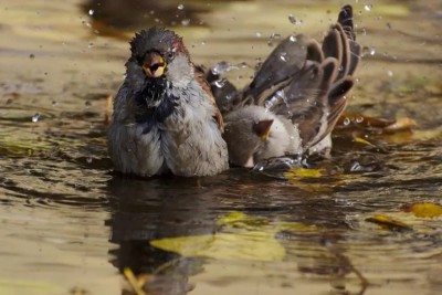 Воробьи купаются в лужах