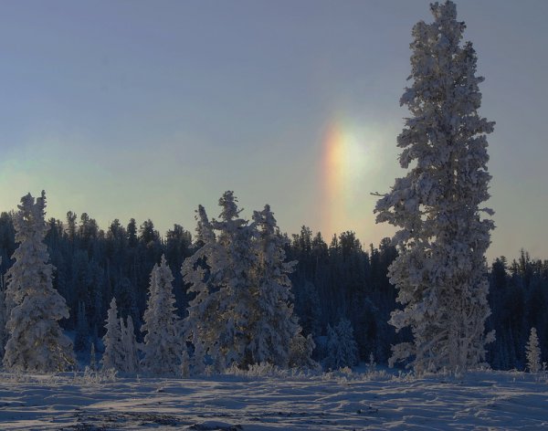 Зимняя радуга в сильные морозы — далеко не редкое явление. В науке этот оптический феномен получил своё название — гало (от французского halo и греческого halos — световое кольцо вокруг Солнца или Луны).
