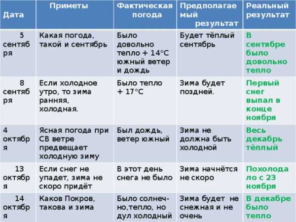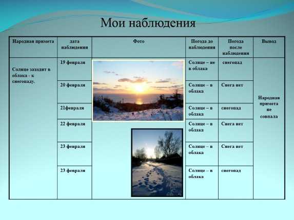 Еще можно сделать вывод, что изменение экологии не повлияло на правильность примет. Климат по-прежнему предсказуем. Наши предки не зря веками наблюдали за погодой, и нам не стоит забывать об их опыте.