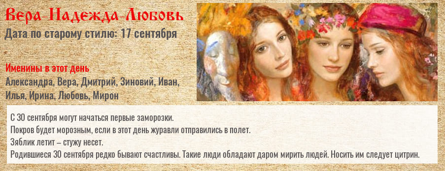 В этот день праздновали именины Вера, Надежда и Любовь, эти имена являлись одними из самых распространенных имен. Женщины часто плакали 30-го сентября, это один из обрядов, призванный защитить от слез в будущем. А молодежь собиралась на вечерние посиделки.
