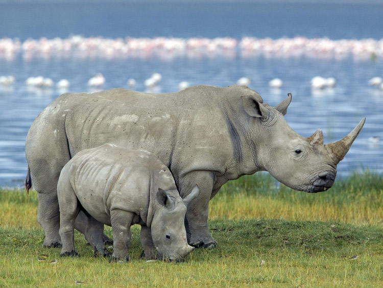 Самка белого носорога с детенышем на берегу озера Накуру.