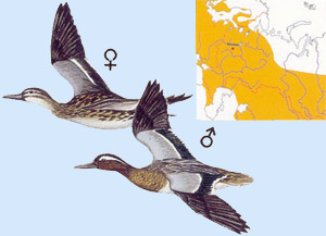 Несколько меньше кряквы; от других речных уток хорошо отличается белым зеркальцем на крыле, заметном на большом расстоянии. Основной тон окраски самцов в брачном наряде — серый, самок и молодых — серо-охристый с пестринами. Голос самца — звонкое покаркивание, самки — трескучее кряканье. Редкий гнездящийся перелетный вид. Населяет пруды рыбхозов, пойменные озера и старицы и другие заросшие водоемы открытых ландшафтов.