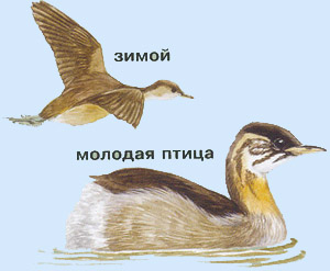 Несколько меньше большой поганки, от которой в брачном наряде отличается каштаново-рыжим цветом передней стороны шеи, светло-серыми щеками и менее развитыми перьевыми "рожками" на голове. В осеннем пере темно-серая шапочка спускается до глаз, белой брови нет, на шее спереди буроватый налёт. Клюв прямой, серый с жёлтым основанием. У молодых осенью сохраняются полосы на голове. В полёте на крыле видны два светлых участка, как у крас-ношейной поганки. Поведение типично для поганок — держится на воде, летает редко, хорошо ныряет. Голос громкий, грубый, разнообразный; его сравнивают с кваканьем, дребезжаньем, ржаньем, резким взвизгиванием.