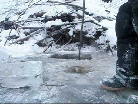 Когда лед будет нормальной толщины, выдерживающей вес человека, можно приступать к охоте. В отмеченном месте необходимо сделать прорубь, размером 50х50 см. Необходимо найти небольшой ствол дерева соответствующей длины. Один конец приготовленного дерева втыкается в дно водоема таким образом, чтобы ствол стоял под углом в 35-45%, а другой должен торчать надо льдом.