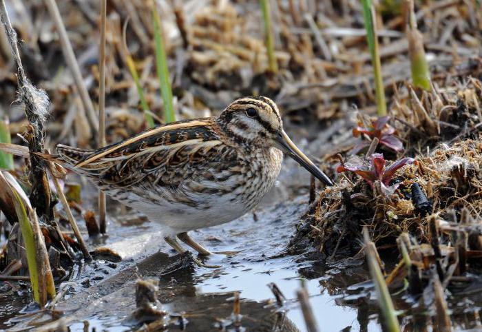 Начнем свой перечень болотно-луговой дичи с бекаса. Он представляет собой небольшую птицу с длинной шеей. Длина крыльев в размахе составляет от 122 до 136 миллиметров. Верхняя часть тела представлена в коричнево-буром окрасе, с небольшими светло-желтыми продольными полосами. Часть груди и зоб – буровато-желтые с мелкими пестринами. Брюшко же имеет белый окрас.