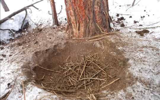 Зимой труднее найти место засидки. Выбирайте локации поближе к зарослям камыша, густым деревьям. Как и в любое другое время на кормежку зверь выходит чаще ночью, чем днем. Лежбище устраивает на муравейниках или под большими елями. По следам на снегу и помету можно определить место нахождения животного.