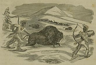 Охота на крупную дичь для пропитания - древний обычай, [7] возможно возникновение с появлением Homo sapiens (анатомически современные люди) и, возможно, еще до этого, учитывая известную склонность других человекообразных обезьян охотиться и даже есть свой собственный вид. [8] Судя по наскальным рисункам, древний человек охотился мамонт в группах, [9] используя комбинацию копий или больших камней, или, альтернативно, сбрасывая животное со скалы.