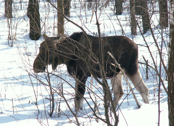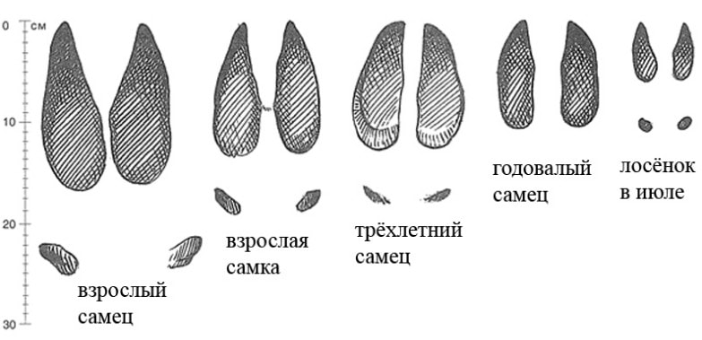 Экскременты самца более округлые и слипшиеся, у самки продолговатые, похожи на желуди. Следы кормления лося зимой — это обломанные ветки, снятая кора с деревьев на высоте 1,5-2 м.