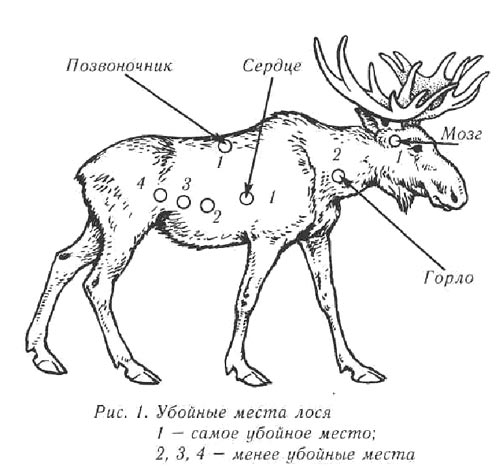 Убойными местами у лосей считаются: грудь в области сердца, головной мозг, шейные и спинные позвонки. Менее эффективными будут попадания в горло и туловище.