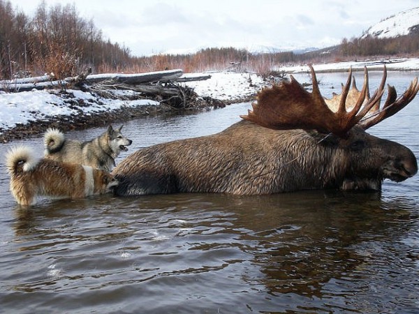 Можно поступать и иначе: держать собак возле себя, на поводке. Стая лаек должна быть приучена вести себя тихо, ведя хозяина по следу лесного великана. Молодых собак, которые могут испугаться исполина, лучше оставить дома: однажды струсив, они уже никогда не будут годны к такой охоте. Идя по следу животного, необходимо внимательно следить за собаками: их поведение заметно изменится, когда лось будет совсем близко. Тогда особо несдержанные лайки могут выдать себя рычанием или даже лаем. Допускать такого ни в коем случае нельзя. Как только лось появится в пределах прямой видимости, свора спускается с поводка. Хорошо вышколенные собаки не бросаются на жертву и не пугают ее лаем; они всего лишь отрезают лосю все пути отхода, дожидаясь охотника.