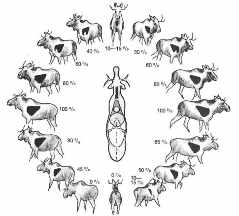 Определиться с примерным процентом успеха вам помогут эти «часы» охотника, на которых рассчитана возможность убойного выстрела в зависимости от положения зверя.