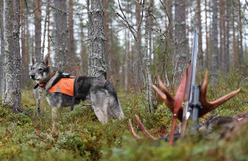 Есть любители использовать в охоте на лося собак. Здесь успех мероприятия определяется не столько мастерством хозяина-стрелка, сколько выучкой и опытом собаки. Наиболее подходящей породой для лосиной охоты считается лайка. Собак нужно выдрессировать на то, чтобы они обнаружили сохатому и бегали вокруг него кругами, подзывая хозяина звонким лаем. Охотник же должен подкрасться к животному за этой шумовой завесой, не спугнув его. Если лось все-таки услышит человека, то сразу же убежит, и никакие собаки его не удержат.