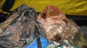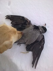 Мой обормот(благородный потомок собаки бАскервилей )Нифига не рубит в охоте. Тока косточки потом точит как профессиональная мясорубка промышленная. И ещё,гад в палатке шмотки на себя одевает когда замерзает. А наши вороны покрупнее его будут. Боюсь унесут.. .