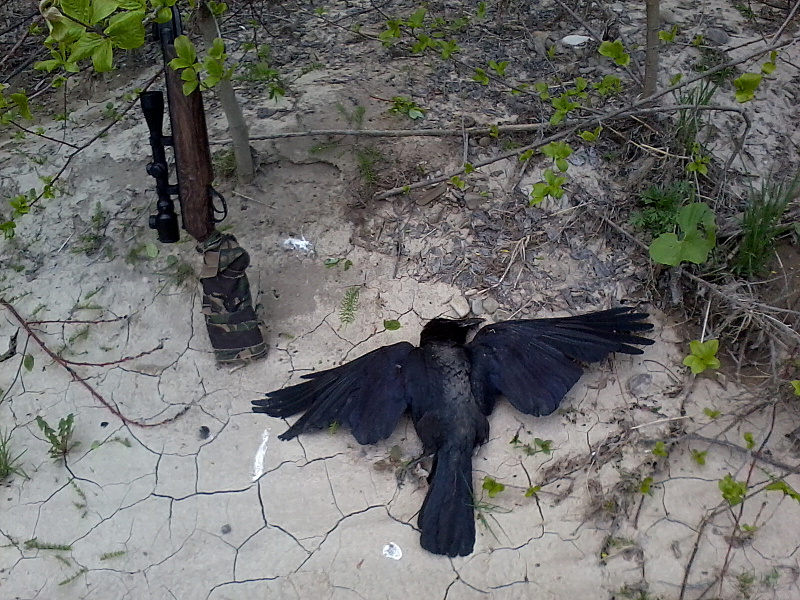 В прошлом году на весенней лежал в поле в маскхалате в окружении профилей и ждал гусей, дак одна серая просто достала меня, все кружит и кружит рядом, гусей даже на горизонте нигде не видать ну а в патронташе патрончик с пятеркой завалялся, не выдержав такой наглости перезарядил и в очередной раз когда она налетела метров с двадцати получила практически весь заряд, даже каркнуть не успела, а как тряпка упала, так как дробь кучно пошла и ей крепко досталось. Что тут началось. собралась надо мной воронка и такой тут ор поднялся, а тут как назло еще и гуси на подлете (закон подлости), в итоге они даже на выстрел не подлетели видя что вороны чем то обеспокоены, так и не было больше гусей в тот день, единственный шанс испортили серые вороны((( Еще был случай, после дуплета по гусям из стаи отделился один и упал на соседнее поле, т.к. было еще только утро и лет только начинался я решил что лучше будет искать его после охоты, но по окончанию общими усилиями найти его не удалось, да и время уже поджимало, поэтому решили на следующий день его поискать, и нашли его, точнее только скелет, да так все было очищенно что хоть в музей сдавай, за несколько часов на сером гусе ни осталось ни одного кусочка мяса и причем все косточки на месте остались. Вот после этого у меня и началась неприязнь к этим тварям, если не в ущерб охоте то без выстрела ворона неподалеку просто так уже не пролетает. Вы спросите как это связано с пневматикой, да просто я купил недавно винт специально чтобы радовать серых друзей, ведь весна уже не за горами, надо будет много ездить и искать перелет гусей, а ворон в это время ой как много в угодьях, вот и припомню я им все)))