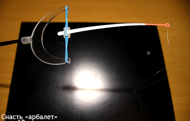 Снасть «арбалет» предназначена, в основном, для охоты на леща зимой. Представляет она собой небольшую удочку с резиновым амортизатором на корпусе.