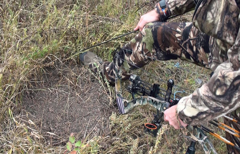 Обходя терновники по периметру, лук нужно всегда держать наизготовку, упираясь указательным пальцем в тетиву, чтобы зафиксировать хват релиза и чувствовать где тетива в готовности растянуть лук. Чтобы снять напряжение с левой руки, постоянно удерживающей лук на весу (вот почему легкие луки предпочтительнее для такой охоты), - нижний блок лука можно упирать в верхнюю часть бедра левой ноги, что дополнительно обеспечит сохранность нижнего блока в кустарнике с амортизацией его флисовым костюмом. Фото Ольга Фрунзэ. Увеличивается по нажатию.