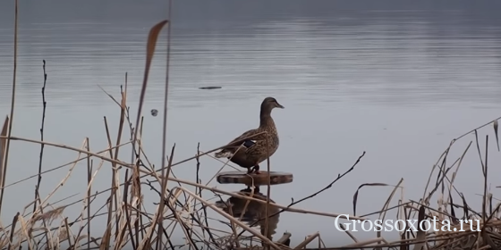 Утка двигается по суше или застыла неподвижно на краю берега. Прицел ловцом направляется в середину туловища.