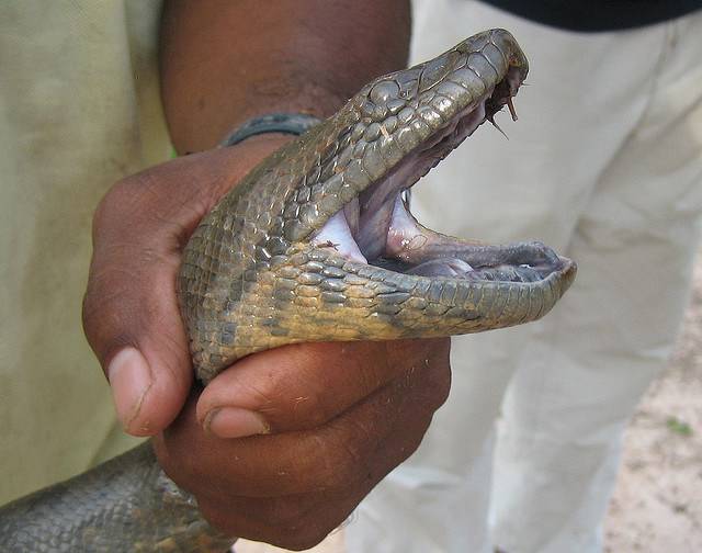 У анаконды короткие зубы, поэтому жертва получает неглубокие укусы, а если ей повезёт вырваться, то раны обычно заживают быстро и без особых последствий.