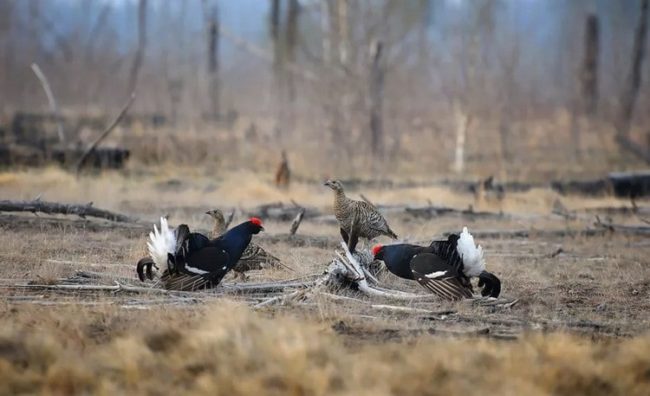 Среди невысокой травы тетерев не будет ходить, поскольку для него это считается небезопасной местностью, но и слишком густые и высокие заросли тоже не подходят.