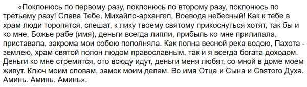 «Да поклонюсь я трижды, да попрошу единожды тебя Архангел Михаил – Воевода небесный. Как к тебе люди идут за помощью, так пусть ко мне они идут за товаром, да не залежится он у меня, мне деньги – вам почет. Да быть по слову моему и велению твоему»