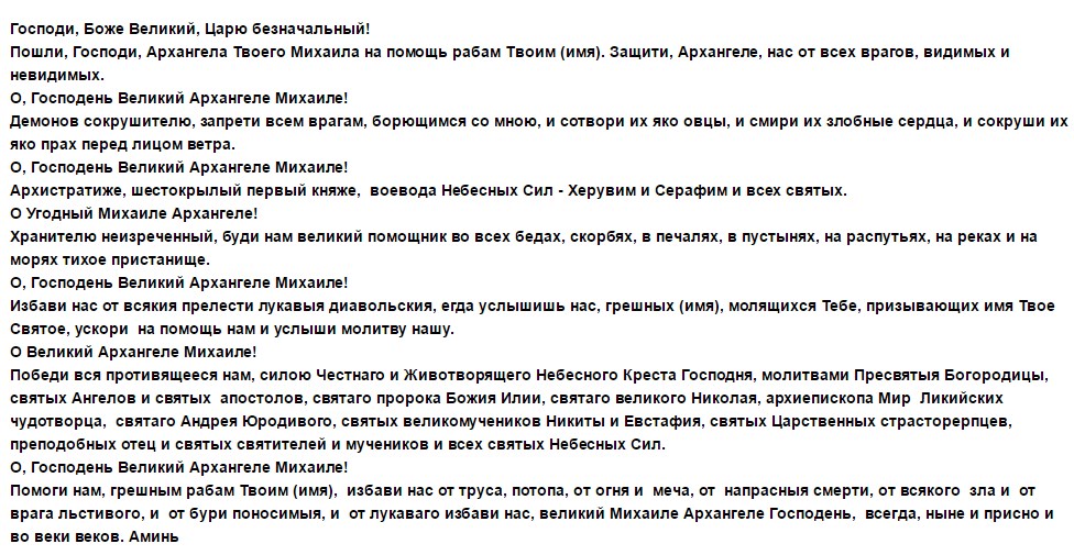 «О свят ангеле светлый Михаиле – помилуй мя, да огради мя ото зла видимых и невидимых врагов, да укрепи мя ото ужаса смертного, да сподоби мя на веру крепкую. Да дай мне силы предстать перед всевышним на суде его праведном. Да не презри молитву мою о заступничестве и помощи в лике твоем святом. Да буду я вкупе с тобой славить Отца и Сына, да Свят Духа.»