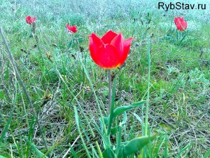 Доехав до места, где дорогу пересекает электрическая линия (на карте обозначено цифрой 2), я повернул вправо к разливам Калауса. Дальше пошла грунтовая дорога. Сразу же после поворота я увидел поляну красных бузлюков, раскинувшуюся на несколько десятков метров. Красные тюльпанчики красовались на поляне.