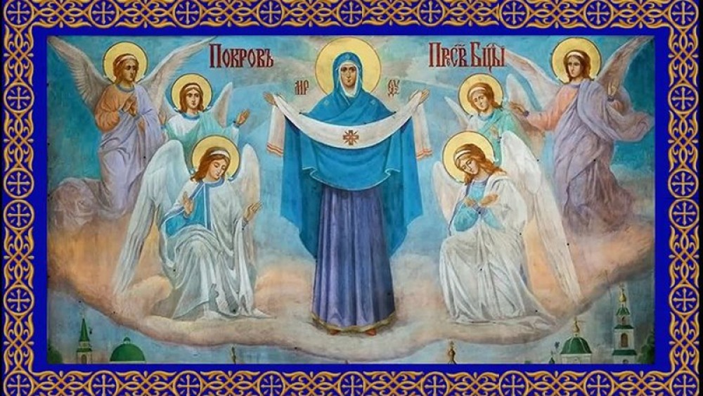 Согласно легенде, когда враги окружили древний византийский город, Дева Мария в окружении ангелов в белоснежных одеждах спустилась с небес. Чтобы защитить невинных людей от нападок иноверцев и от смерти от вражеской руки, Богородица сняла с себя сияющее покрывало и накрыла им всех горожан до единого.