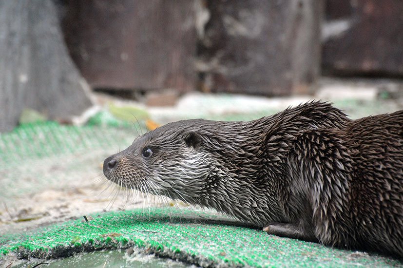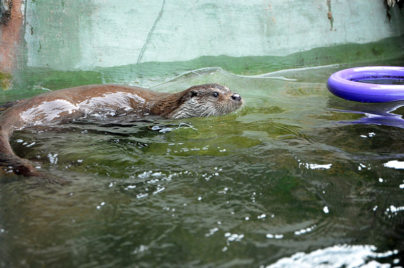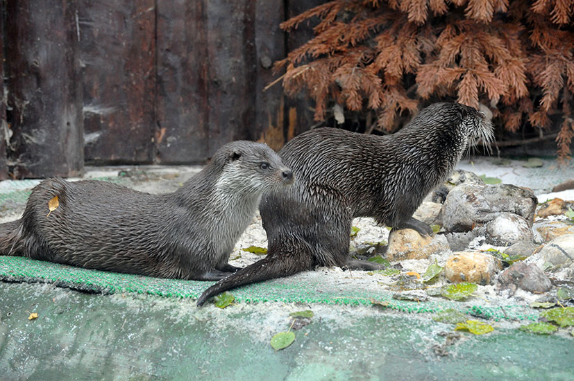 В зоопарке наши выдры живут уже давно, их можно назвать даже старожилами. Животные хоть и очень взрослые (самец Гаврил родился в 2007 году, а самка Льдина в 2005 году), радуются посетителям, как маленькие, и даже устраивают ради них «шоу» - прыгают, стоят столбиками, извиваются в воде вьюнами. Выдры очень любят как пловцы в бассейне «накручивать километраж», плавая на спине от одного края вольера к другому. Вольер у выдр просторный, соединяет в себе три небольших бассейна разной формы и глубины с проточной водой. Есть у зверьков и возможность спрятаться от внимания посетителей, они могут в любой момент скрыться во внутренние убежища через маленькие квадратные отверстия, занавешенные прозрачной резиновой дверцей, и расположенные внизу деревянной стены вольера.