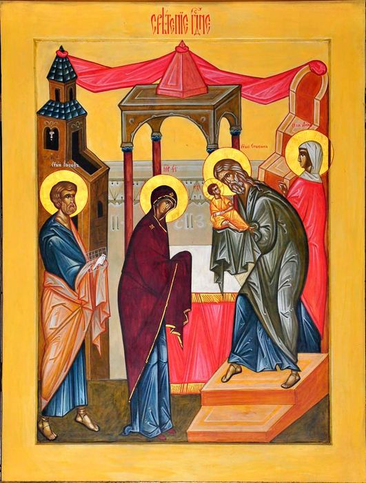 Там их встретил праведный старец Симеон. За 3 века до этого, выполняя перевод с еврейского языка на греческий священного писания, он увидел фразу о том, что непорочная девушка родит ребенка. Он не поверил в это, и решил написать, что это будет жена. В это время перед ним явился ангел, который сказал, что Симеон будет жить до тех пор, пока не убедится в искренности этих слов.