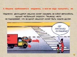 4. Машина приближается медленно, и все же надо пропустить ее. Медленно движущаяся машина может скрывать за собой автомобиль, идущий на большой скорости. Пешеход часто не подозревает, что за одной машиной может быть скрыта другая.