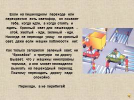 Если на пешеходном переходе или перекрестке есть светофор, он покажет тебе, когда идти, а когда стоять и ждать. Красный свет для пешеходов - стой, желтый - жди, зеленый - иди. Никогда не переходи улицу на красный свет, даже если машин поблизости нет. Как только загорелся зеленый свет, не "бросайся" с тротуара на дорогу. Бывает, что у машины неисправны тормоза, и она может неожиданно выехать на пешеходный переход. Поэтому переходить дорогу надо спокойно. Переходи, а не перебегай!