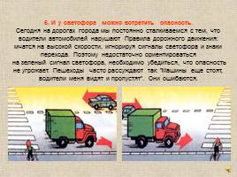 5. И у светофора можно встретить опасность. Сегодня на дорогах города мы постоянно сталкиваемся с тем, что водители автомобилей нарушают Правила дорожного движения: мчатся на высокой скорости, игнорируя сигналы светофора и знаки перехода. Поэтому недостаточно ориентироваться на зеленый сигнал светофора, необходимо убедиться, что опасность не угрожает. Пешеходы часто рассуждают так: "Машины еще стоят, водители меня видят и пропустят". Они ошибаются.