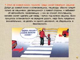 7. Стоя на осевой линии, помните: сзади может оказаться машина! Дойдя до осевой линии и остановившись, пешеходы обычно следят только за машинами, двигающимися с правой стороны, и забывают об автомобилях проезжающих у них за спиной. Испугавшись, человек может сделать шаг назад - прямо под колеса машины. Если пришлось остановиться на середине дороги, надо быть предельно внимательным, не делать ни одного движения, не убедившись в безопасности.