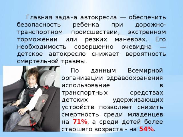 По данным Всемирной организации здравоохранения использование в транспортных средствах детских удерживающих устройств позволяет снизить смертность среди младенцев на 71% , а среди детей более старшего возраста - на 54% .