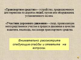 «Транспортное средство» устройство, предназначенное для перевозки по дорогам людей, грузов или оборудования, установленного на нем. «Участник дорожного движения» лицо, принимающее непосредственное участие в процессе движения в качестве водителя, пешехода, пассажира транспортного средства. Внимательно рассмотрите следующие слайды и ответьте на вопросы.