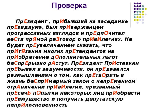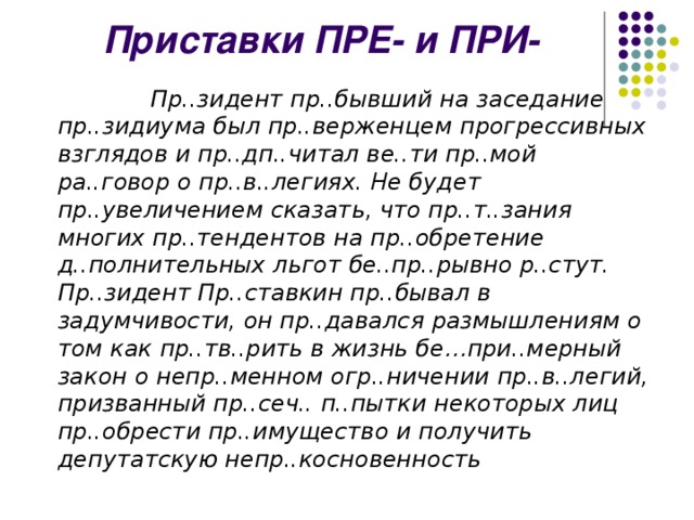 Пр..зидент пр..бывший на заседание пр..зидиума был пр..верженцем прогрессивных взглядов и пр..дп..читал ве..ти пр..мой ра..говор о пр..в..легиях. Не будет пр..увеличением сказать, что пр..т..зания многих пр..тендентов на пр..обретение д..полнительных льгот бе..пр..рывно р..стут. Пр..зидент Пр..ставкин пр..бывал в задумчивости, он пр..давался размышлениям о том как пр..тв..рить в жизнь бе…при..мерный закон о непр..менном огр..ничении пр..в..легий, призванный пр..сеч.. п..пытки некоторых лиц пр..обрести пр..имущество и получить депутатскую непр..косновенность