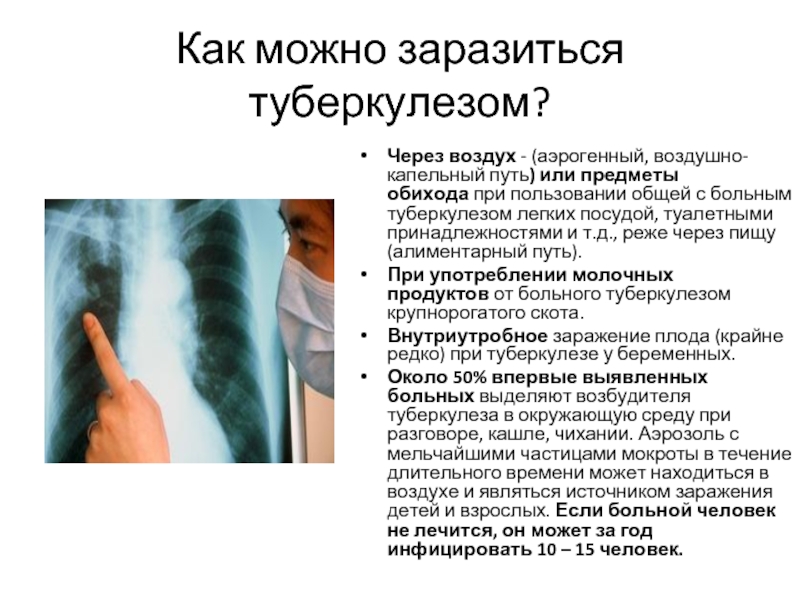 Около 50% впервые выявленных больных выделяют возбудителя туберкулеза в окружающую среду при разговоре, кашле, чихании. Аэрозоль с мельчайшими частицами мокроты в течение длительного времени может находиться в воздухе и являться источником заражения детей и взрослых. Если больной человек не лечится, он может за год инфицировать 10 – 15 человек.