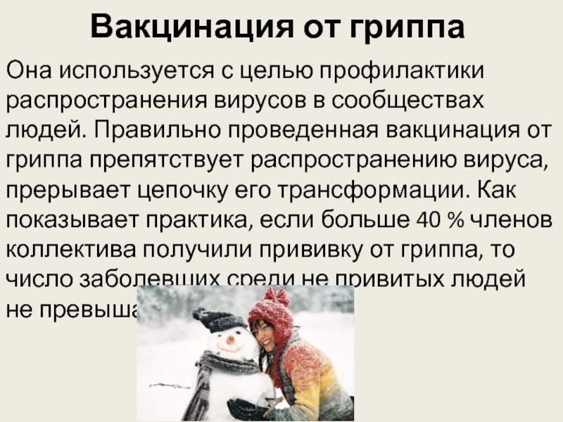 Она используется с целью профилактики распространения вирусов в сообществах людей. Правильно проведенная вакцинация от гриппа препятствует распространению вируса, прерывает цепочку его трансформации. Как показывает практика, если больше 40 % членов коллектива получили прививку от гриппа, то число заболевших среди не привитых людей не превышает 10 %.