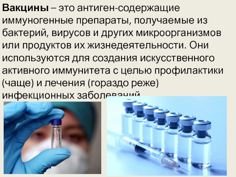Вакцины – это антиген-содержащие иммуногенные препараты, получаемые из бактерий, вирусов и других микроорганизмов или продуктов их жизнедеятельности. Они используются для создания искусственного активного иммунитета с целью профилактики (чаще) и лечения (гораздо реже) инфекционных заболеваний.