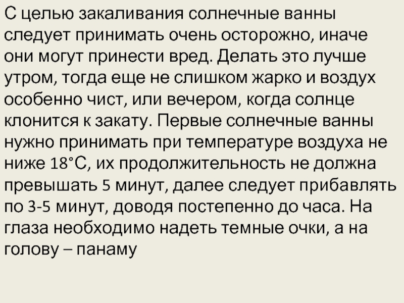 С целью закаливания солнечные ванны следует принимать очень осторожно, иначе они могут принести вред. Делать это лучше утром, тогда еще не слишком жарко и воздух особенно чист, или вечером, когда солнце клонится к закату. Первые солнечные ванны нужно принимать при температуре воздуха не ниже 18°С, их продолжительность не должна превышать 5 минут, далее следует прибавлять по 3-5 минут, доводя постепенно до часа. На глаза необходимо надеть темные очки, а на голову – панаму