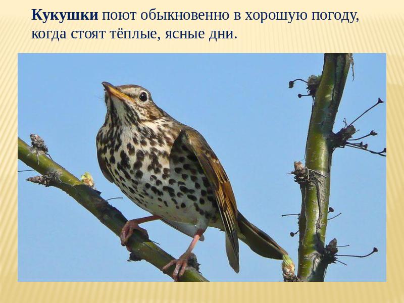 Кукушки поют обыкновенно в хорошую погоду, когда стоят тёплые, ясные дни.