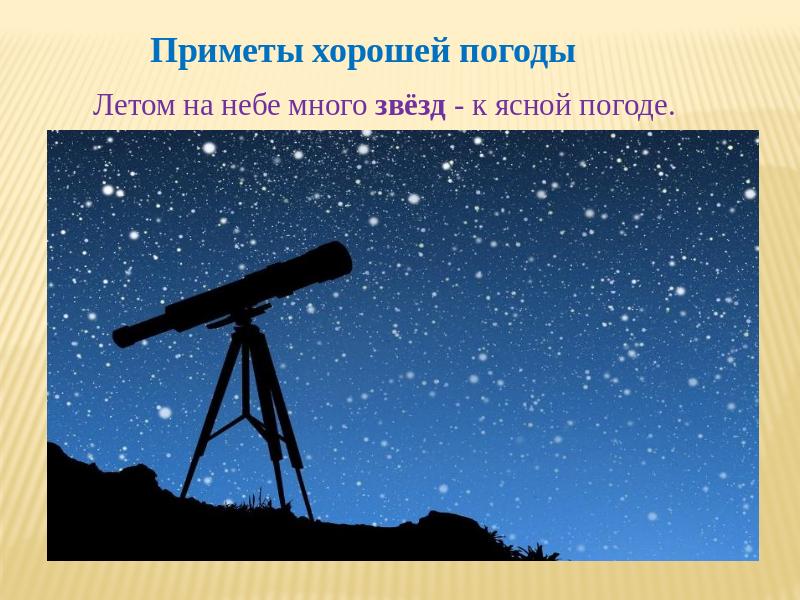 Приметы хорошей погоды Летом на небе много звёзд - к ясной погоде.