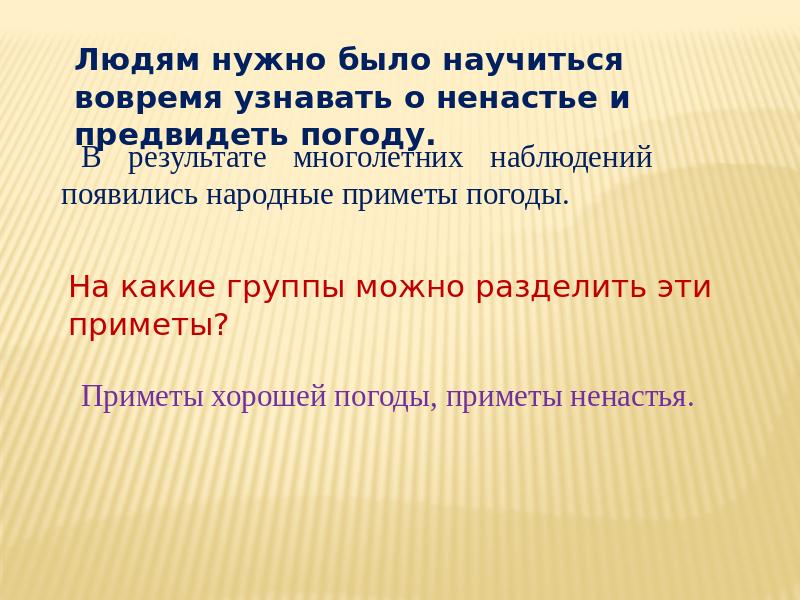 В результате многолетних наблюдений появились народные приметы погоды. Людям нужно было научиться вовремя узнавать о ненастье и предвидеть погоду. На какие группы можно разделить эти приметы? Приметы хорошей погоды, приметы ненастья.
