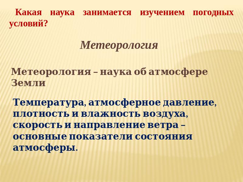 Какая наука занимается изучением погодных условий? Метеорология Метеорология – наука об атмосфере Земли Температура, атмосферное давление, плотность и влажность воздуха, скорость и направление ветра – основные показатели состояния атмосферы.