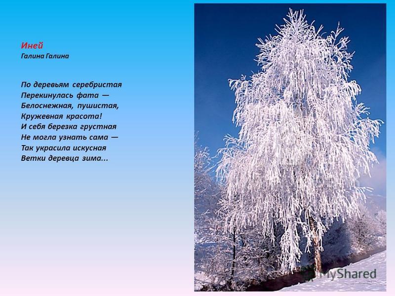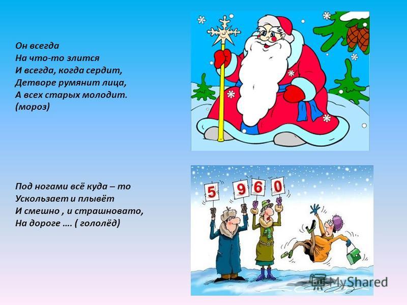 А в этой загадке, о каком месяце говорится? Щиплет уши, щиплет нос, Лезет в валенки мороз. Брызнешь воду - упадет Не вода уже, а лед. Даже птице не лечится, От мороза стынет птица, Повернулось солнце к лету. Что, скажи, за месяц это? Январь в народе называют студень, ледень. Это коренной месяц зимы. В это время деревья надевают красивый наряд пушистой изморози.