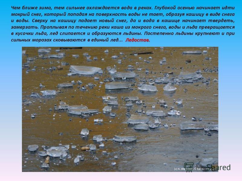 Ледостав. Чем ближе зима, тем сильнее охлаждается вода в реках. Глубокой осенью начинает идти мокрый снег, который попадая на поверхность воды не тает, образуя кашицу в виде снега и воды. Сверху на кашицу падает новый снег, да и вода в кашице начинает твердеть, замерзать. Проплывая по течению реки каша из мокрого снега, воды и льда превращается в кусочки льда, лед слипается и образуются льдины. Постепенно льдины крупнеют и при сильных морозах сковываются в единый лед. Ледостав.