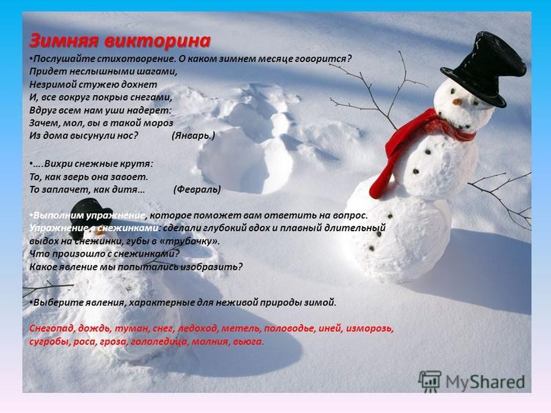 Сосулька Еще один непременный атрибут зимы – Сосулька – кусок льда конусообразной формы, который свисает с какой-либо плоскости. Днем солнце прогревает снег, он начинает таять и подтекать, а ночью мороз усиливается, все вокруг замерзает. Масса сосульки растет по мере таяния снега, потом она обрушивается от собственного веса и рассыпается от столкновения с землей. Выберите явления, характерные для неживой природы зимой. Снегопад, дождь, туман, снег, ледоход, метель, половодье, иней, изморозь, сугробы, роса, гроза, гололедица, молния, вьюга. ….Вихри снежные крутя: То, как зверь она завоет. То заплачет, как дитя… (Февраль) Выполним упражнение, которое поможет вам ответить на вопрос. Упражнение с снежинками: сделали глубокий вдох и плавный длительный выдох на снежинки, губы в «трубочку». Что произошло с снежинками? Какое явление мы попытались изобразить? Зимняя викторина Послушайте стихотворение. О каком зимнем месяце говорится? Придет неслышными шагами, Незримой стужею дохнет И, все вокруг покрыв снегами, Вдруг всем нам уши надерет: Зачем, мол, вы в такой мороз Из дома высунули нос? (Январь.)